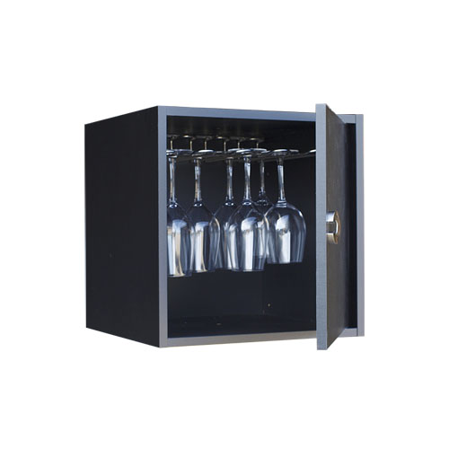 Características técnicas: puerta frontal con cierre seguro, soporte integrado para copas.