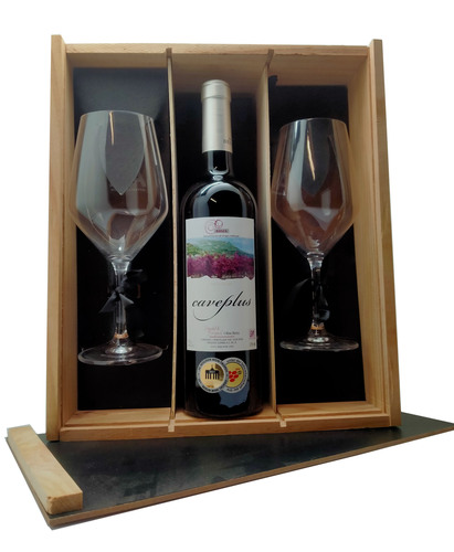 Estuche de regalo especial con 2 copas diseño de 52 cl. ideales para brindar y botella de vino de la prestigiosa D.O.C. Rioja H Bienzóval tinto botella de 75 cl. con 4 meses barrica