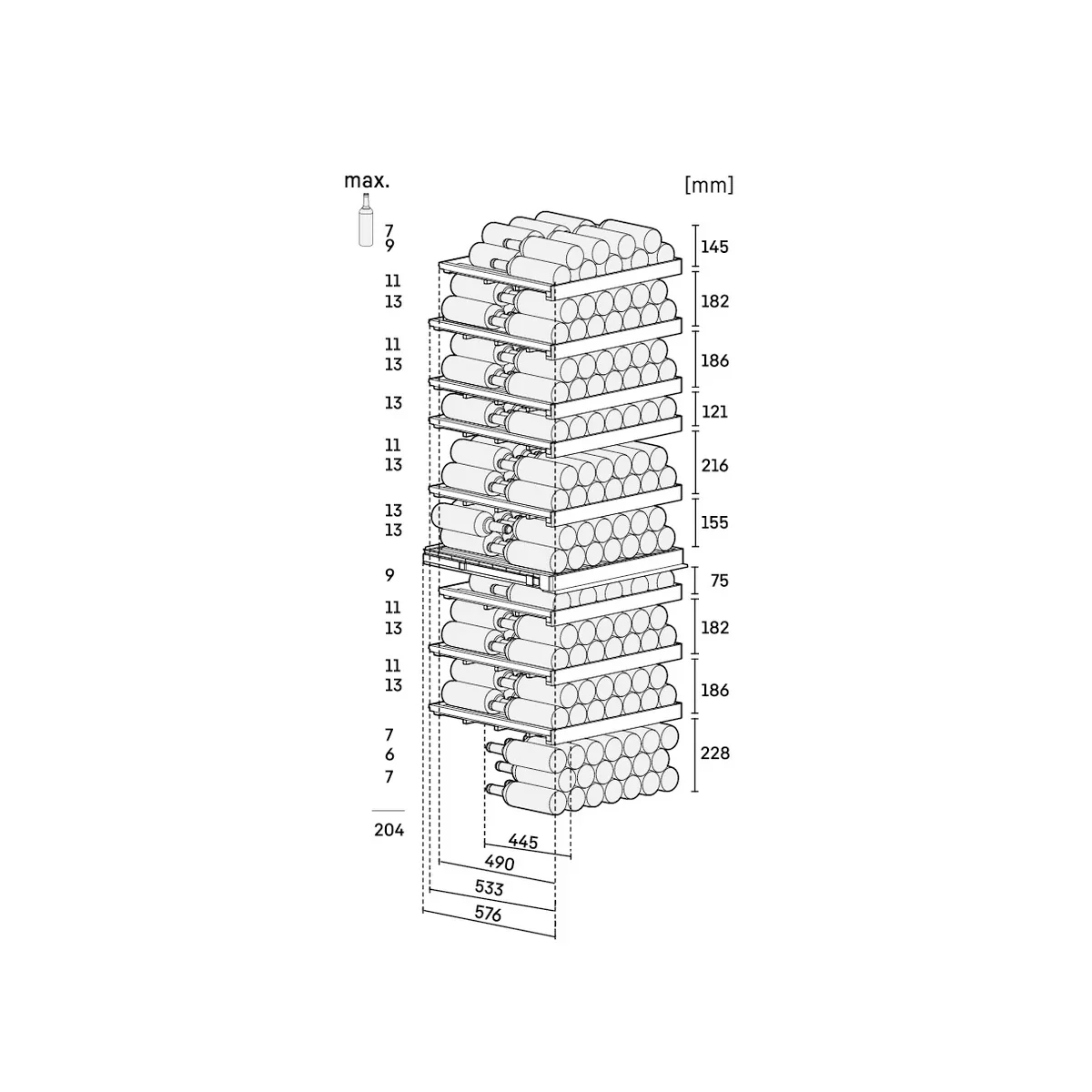 Capacidad de botellas 204 – 201,3 x 69,7 x 76,4 cm (alto x ancho x fondo)